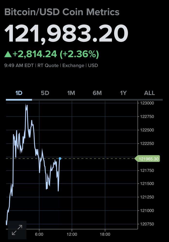 At 9:17 a.m. ET, the biggest cryptocurrency by market capitalisation was trading at $121,855.