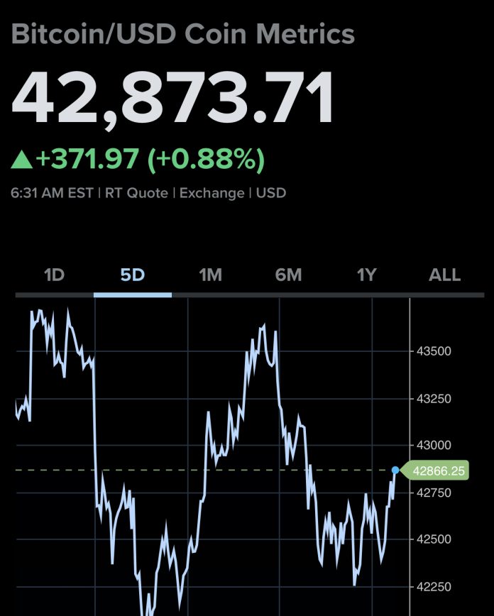 In recent weeks, the price of Bitcoin has experienced significant volatility, with its value fluctuating wildly. However, there are signs indicating that it is currently on an upward trajectory. At exactly 6:31 AM EST on Friday, December 29, 2023, Bitcoin registered a trading price of $42,873.71, reflecting a 0.88% increase compared to the previous day. It is worth noting that Bitcoin had previously suffered a decline of nearly 6% earlier in the week.
