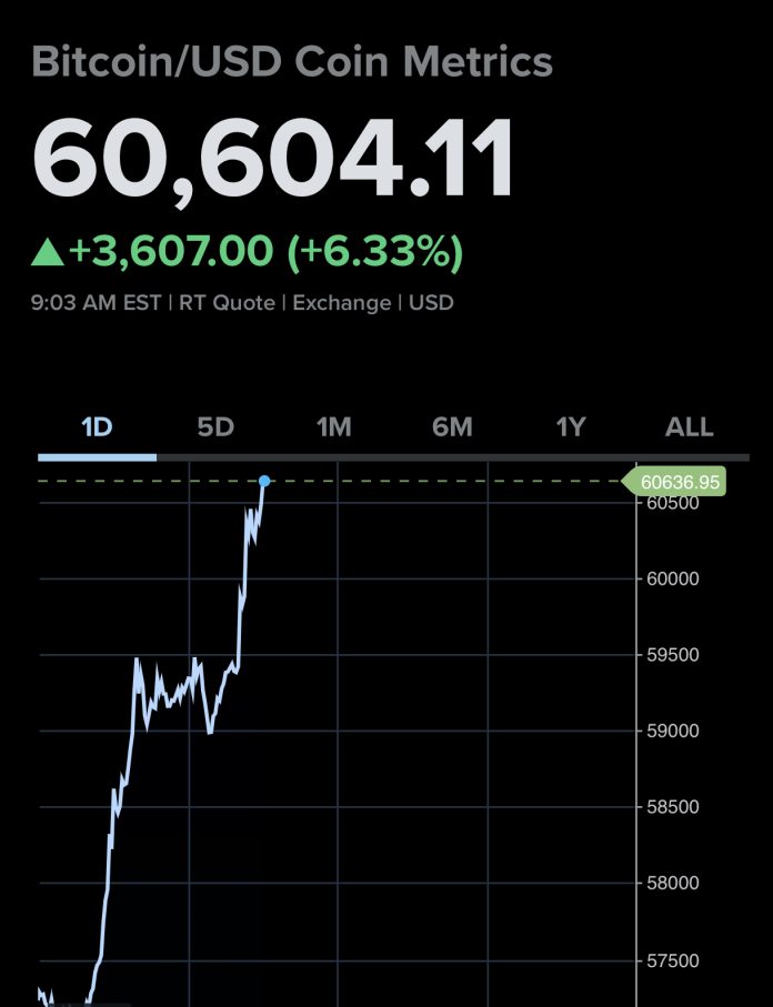 Wednesday saw Bitcoin continue its ascent, breaking above $60,000 for the first time since November 2021.