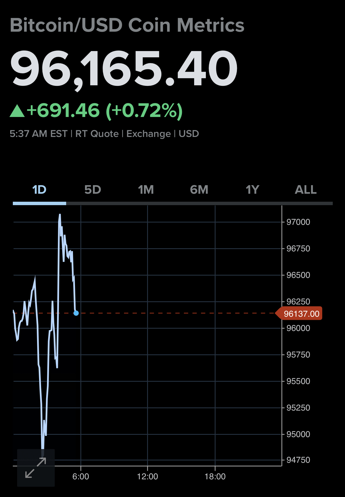 Bitcoin was trading at $96,165.40, up $691.46 or +0.72% from the previous day’s close.