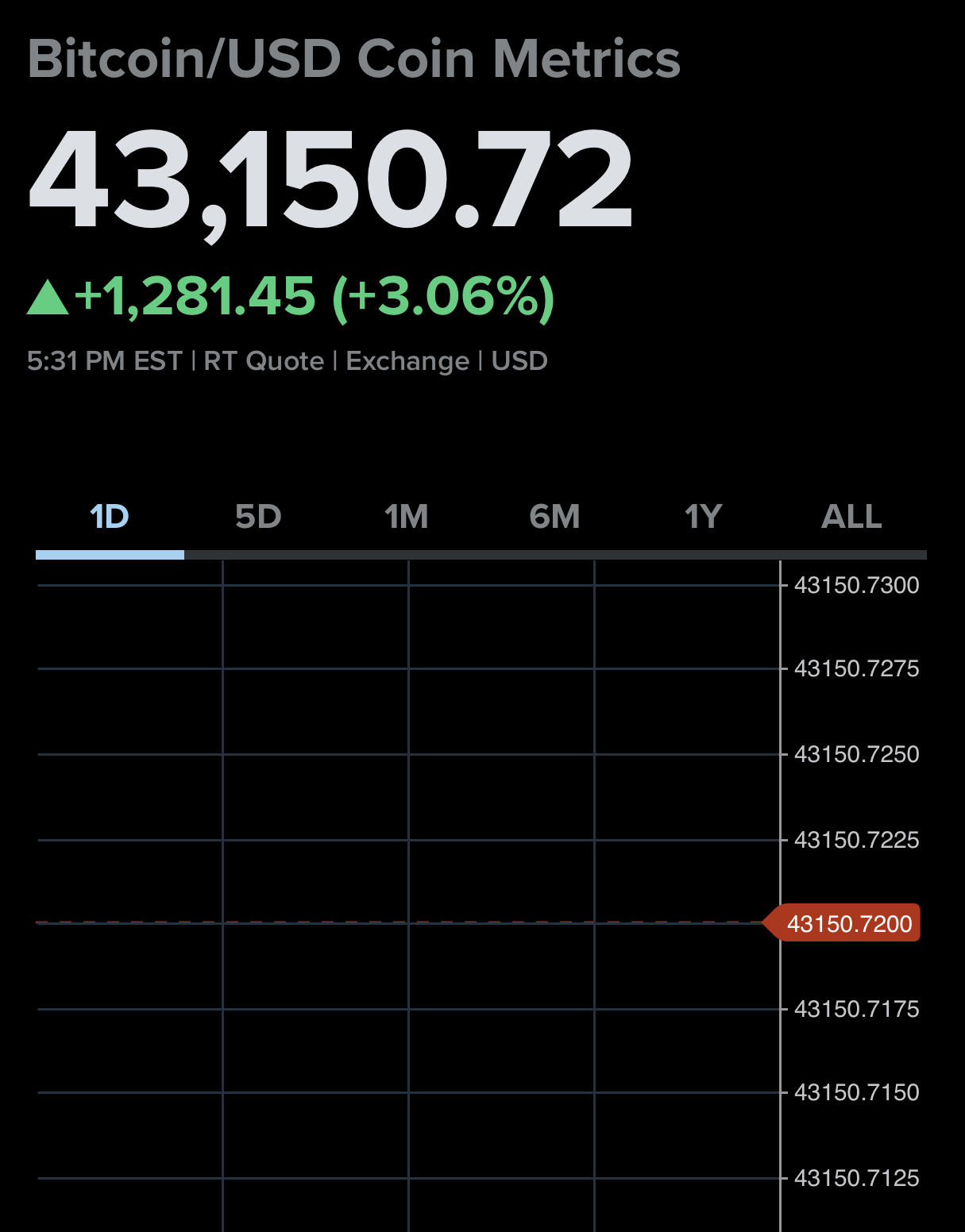 The price of Bitcoin in US dollars for the previous day is displayed on the chart. Bitcoin is now trading at $43,150.72 as of 5:31 PM EST on January 29, 2024, up 3.06% from the previous day.