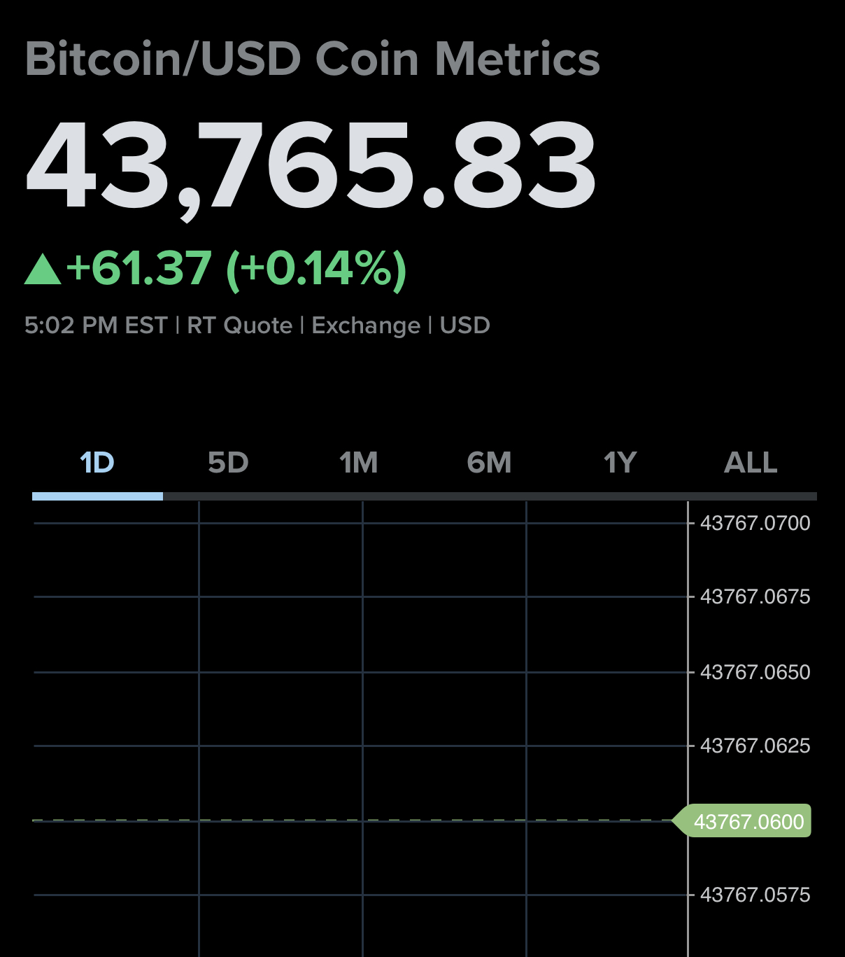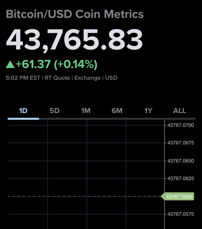 The provided chart illustrates the USD price fluctuations of Bitcoin within the last 24 hours. At 5:02 PM EST, the current price stands at $43,765.83, reflecting an increase of $61.37 (+0.14%) compared to the previous day. Additionally, the chart includes the highest and lowest prices observed during the day, along with the opening price.