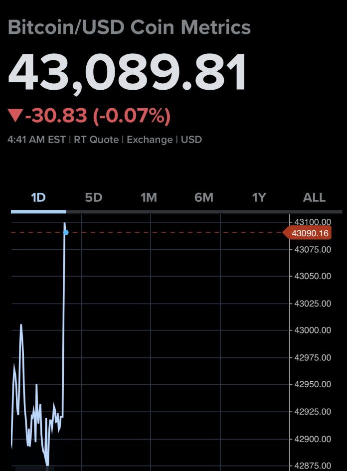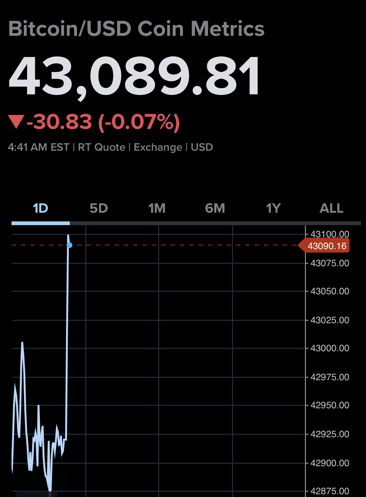 The graph displays the price of Bitcoin during the previous day. Between $43,075 and $43,100, the price has been comparatively constant. On February 7, 2024, at 4:41 AM EST, the price is $43,089.81, down 0.07% from the day before.