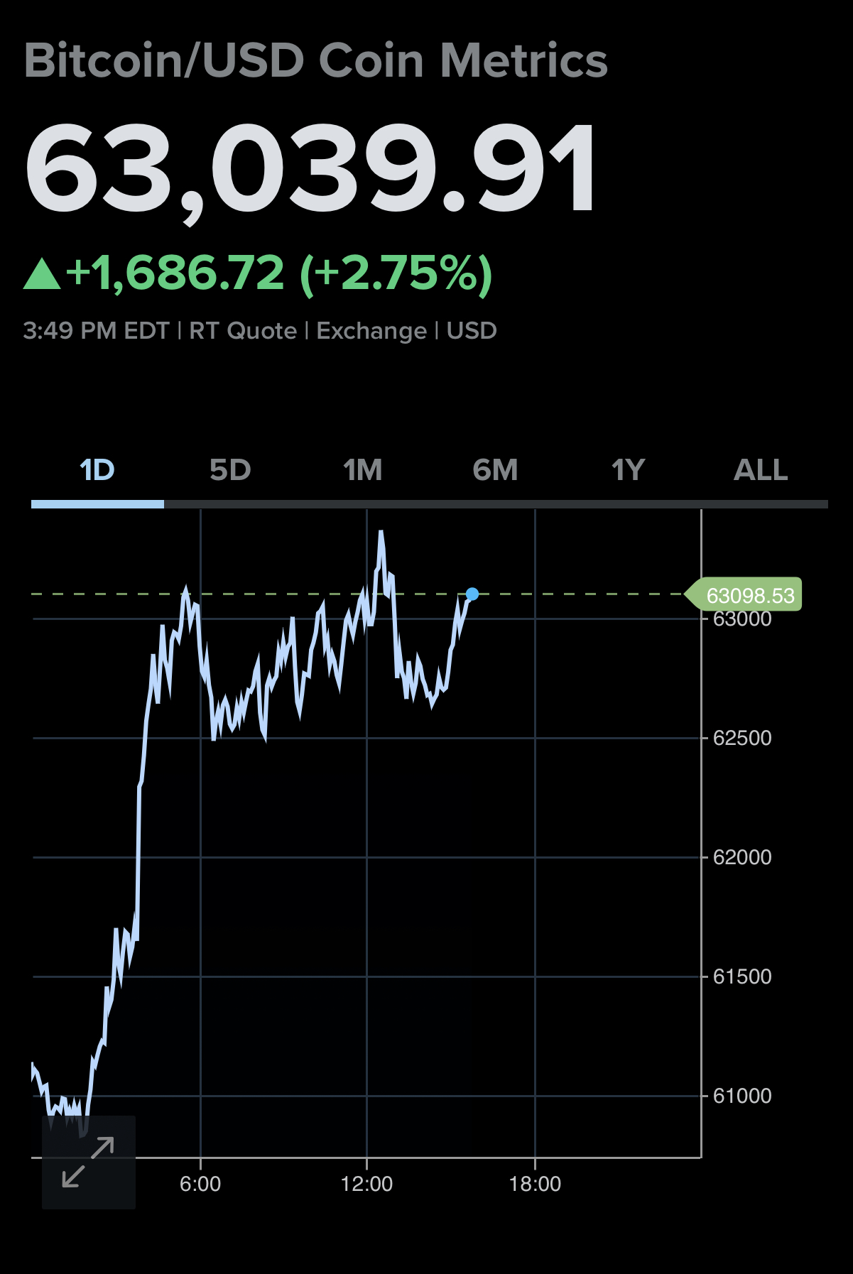 Bitcoin in the past day. At $63,039.91, the price has increased by 2.75 percent over yesterday.