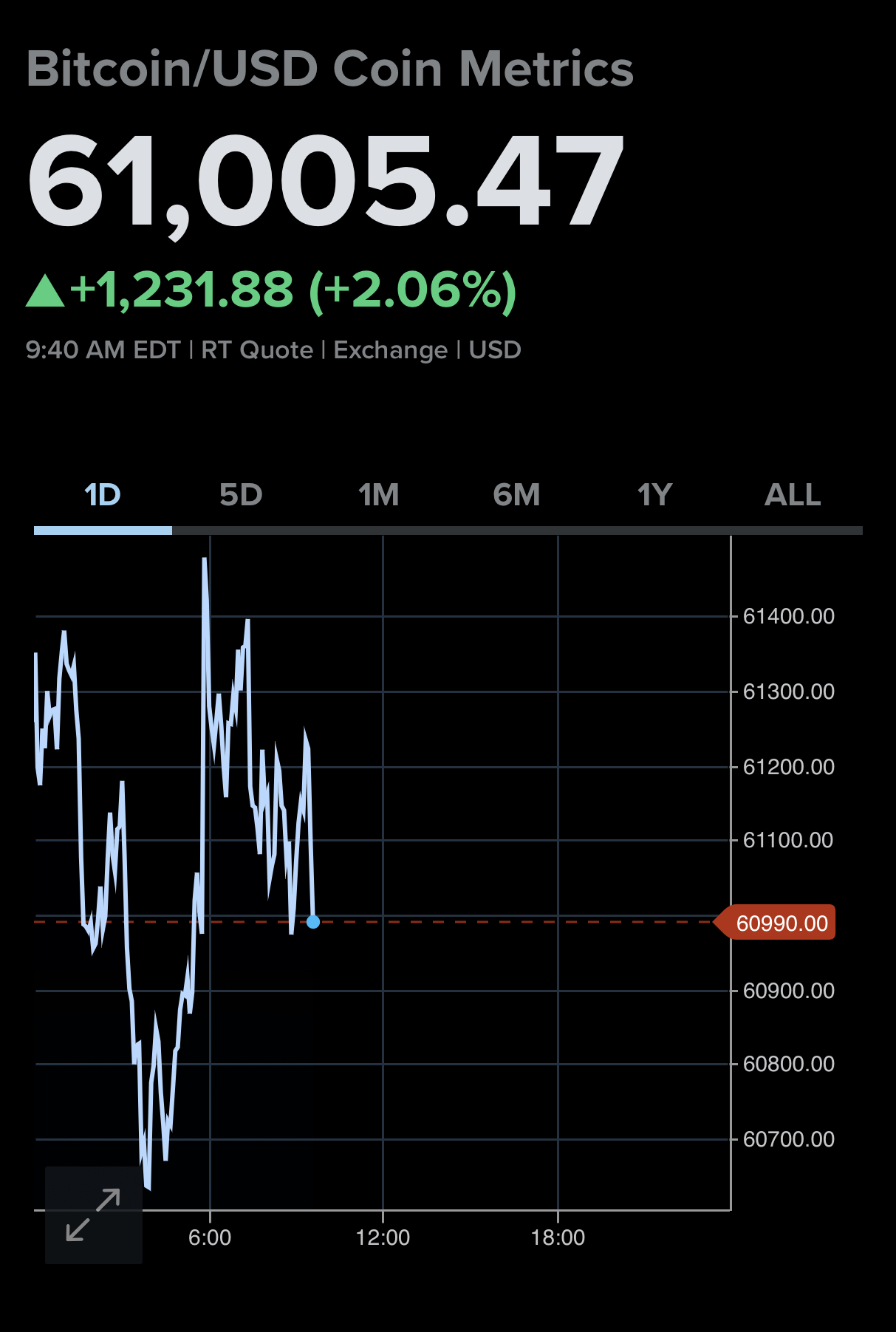 The current price is $61,005.47, up $1,231.88 from the previous day. This follows a couple days of price drops for Bitcoin.