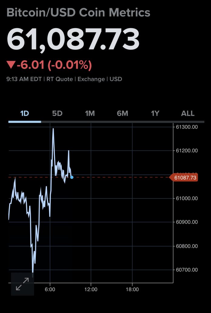 US dollars (USD) versus bitcoin (BTC) throughout the previous day. Bitcoin’s price, which is currently trading at $61,087.73, has been comparatively stable over the previous day. This represents a little decrease from the close of $60,644.97 the day before.