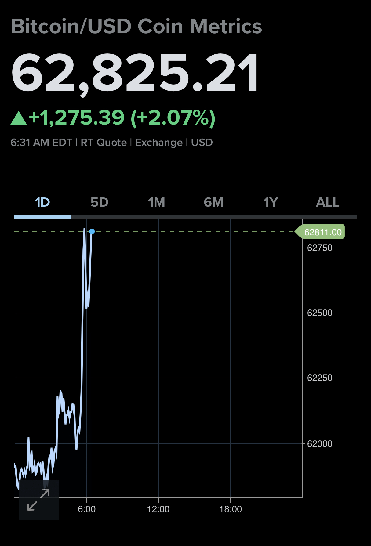 Bitcoin (BTC) over the previous day in US dollars (USD). The price of Bitcoin was $62,825.21, up $1,275.39 (+2.07%) from the day before.