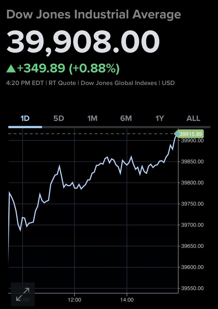 At 39,908.00, the Dow Jones Industrial Average increased 349.89 points, or 0.88%, from its starting point.