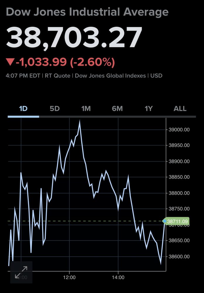 2.7%, or 1,075 points, were taken off the Dow. The Dow Jones Industrial Average fell 3.7%, while the S&P 500 fell 3.2%.