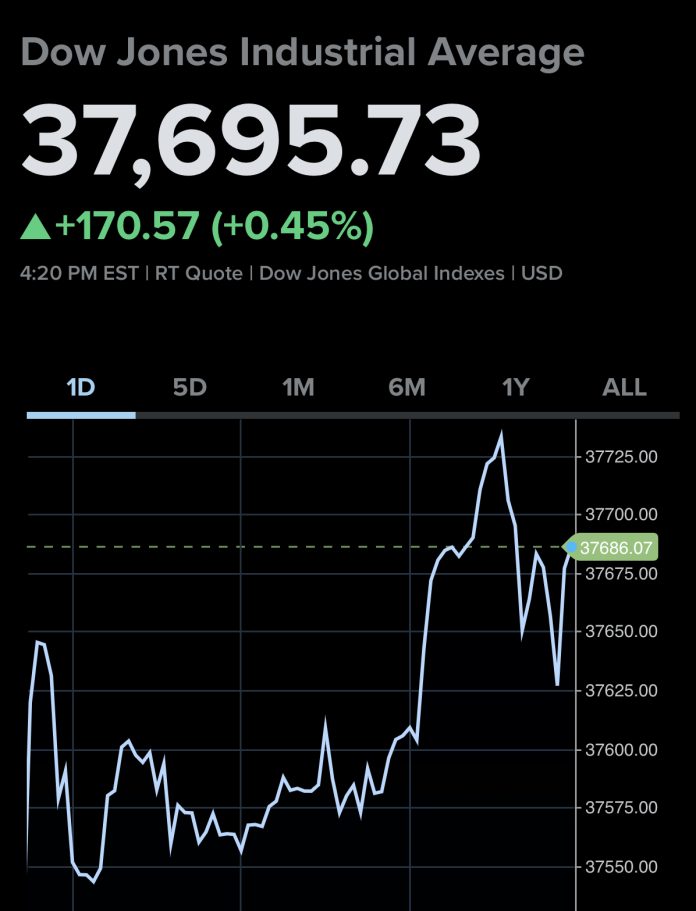 The S&P 500 registered a 0.57% gain, closing at 4,783.45, while the Dow Jones Industrial Average closed 170.57 points higher, or 0.45%, at 37,695.73. Similarly, the Nasdaq Composite saw an increase of 0.75%, settling at 14,969.65.