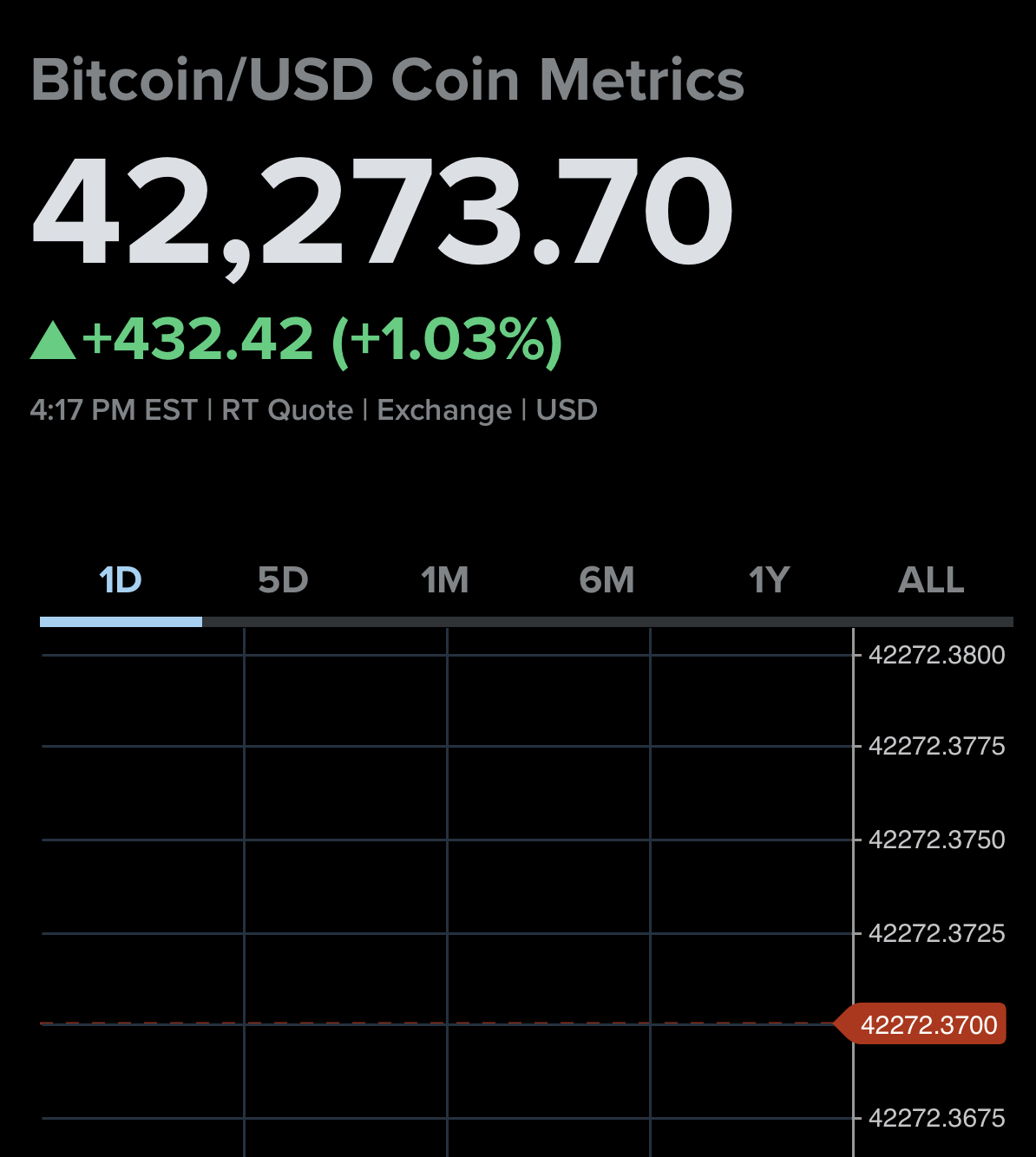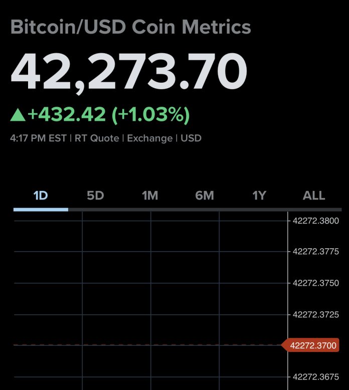 In recent days, Bitcoin has experienced a remarkable surge, exceeding a 10% increase since the previous week. Visual analysis of the past 24-hour chart clearly displays an upward trajectory in the price of Bitcoin. As of 4:17 PM EST, the current trading value for Bitcoin stands at $42,273.70, reflecting a 1.03% rise from the previous day. Several factors may have contributed to this surge, such as augmented institutional investments and favorable news coverage. Nevertheless, it is crucial to bear in mind that Bitcoin remains an exceptionally volatile asset, and there exists the possibility of future price crashes.