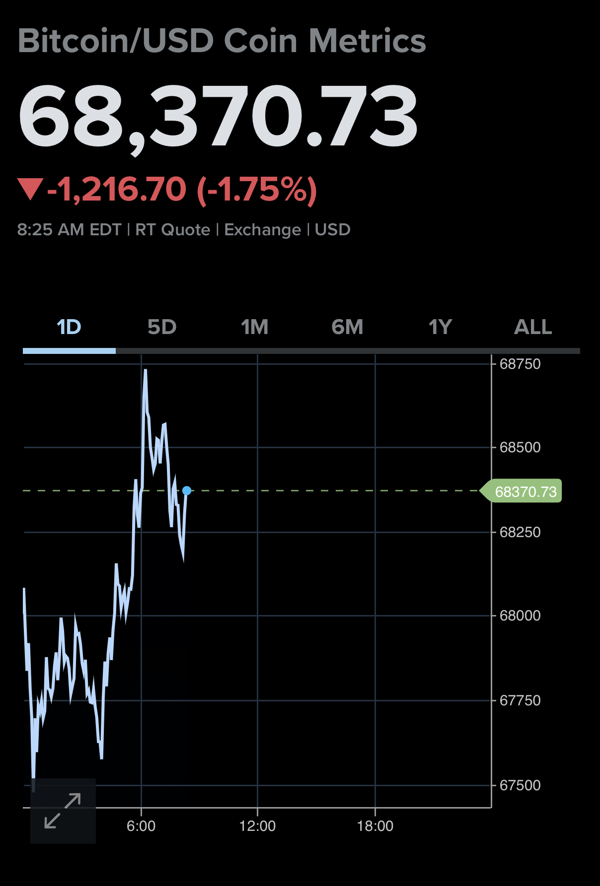 Bitcoin in the past day. The price is now $68,370.73, down 1.75% from yesterday.