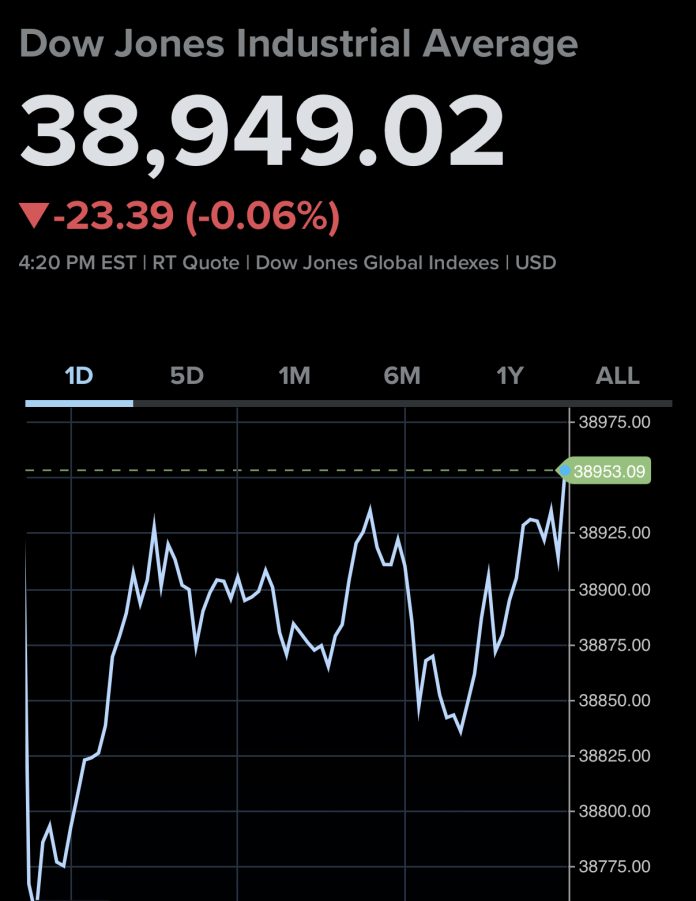 The S&P 500 retreated by 0.17%, closing at 5,069.76. Similarly, the Nasdaq Composite declined by 0.55% to settle at 15,947.74. The Dow Jones Industrial Average ended the day with a loss of 23.39 points, or 0.06%, reaching 38,949.02, marking the third consecutive day of declines.