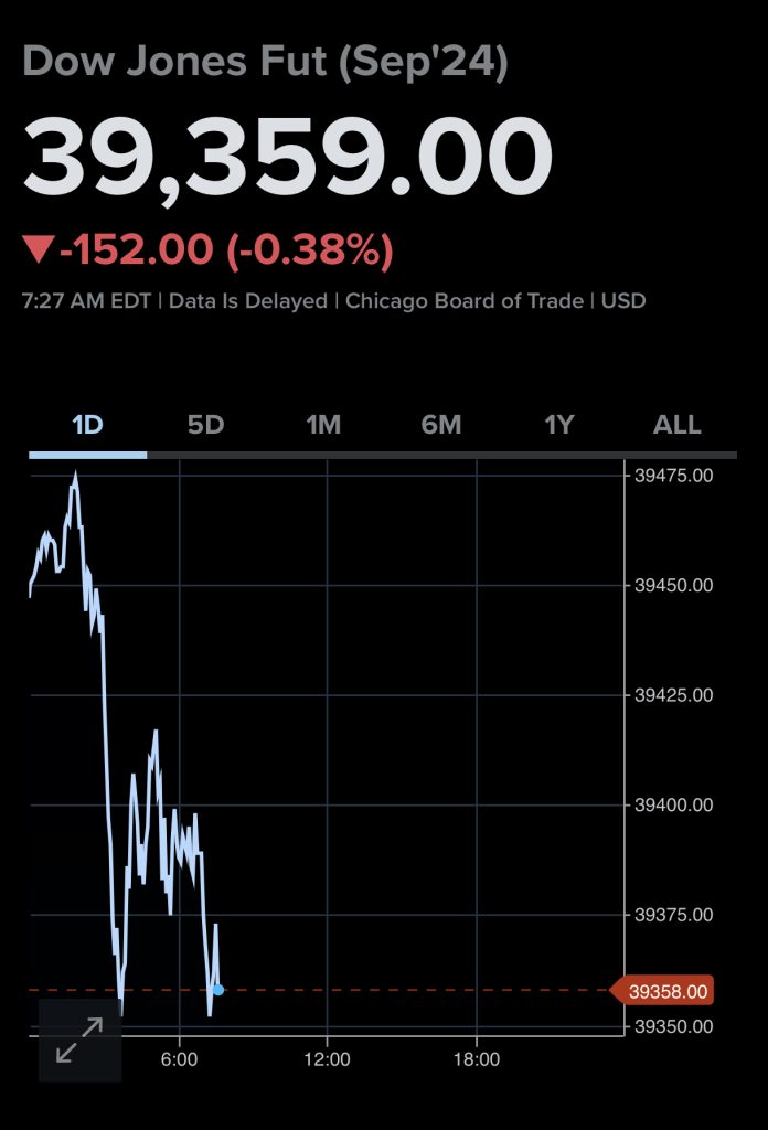 Dow Jones Industrial Average futures decreased by 0.4%, or 151 points. Futures on the Nasdaq 100 fell along with the S&P 500, down 0.45% and 0.6%, respectively.