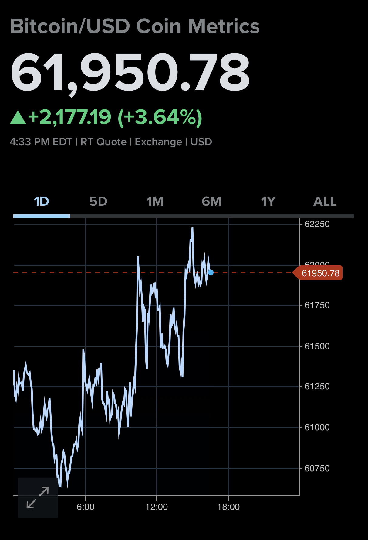The price of bitcoin increased by almost 3% on Tuesday to $62,103.90.