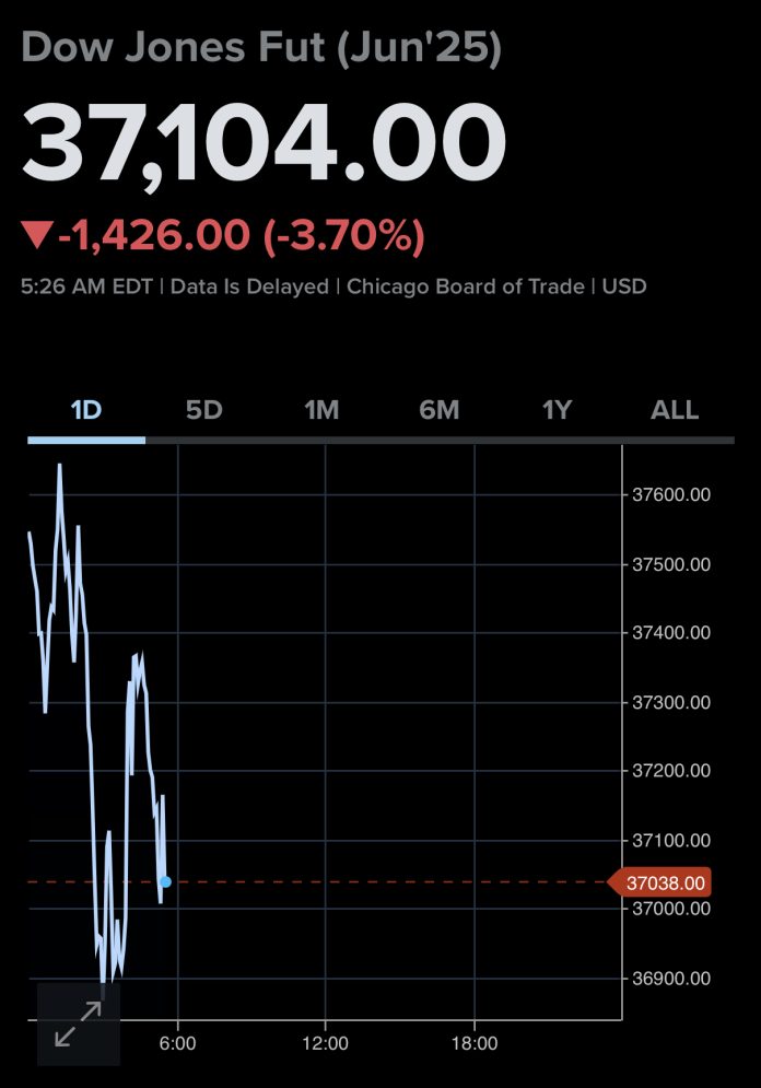 Indicating a possible bear market, S&P 500 futures plunged 3.8%, while Dow Jones Industrial Average futures slid 1,376 points (3.6%). Nasdaq-100 futures saw a 4.1% decline as investors sought cash instead of technology equities.