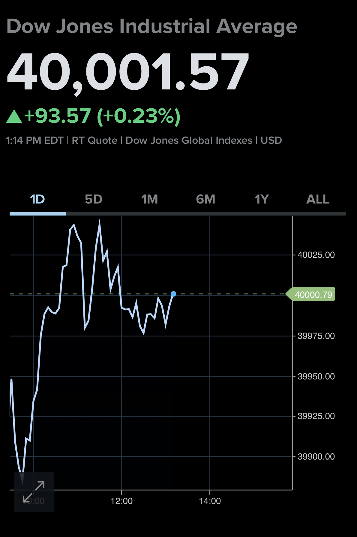 The Dow Jones Industrial Average surpassed 40,000 for the first time, as the bull market surged higher on expectations that inflationary pressures would subside and interest rates would fall. The Dow closed up 83 points, or 0.2%.