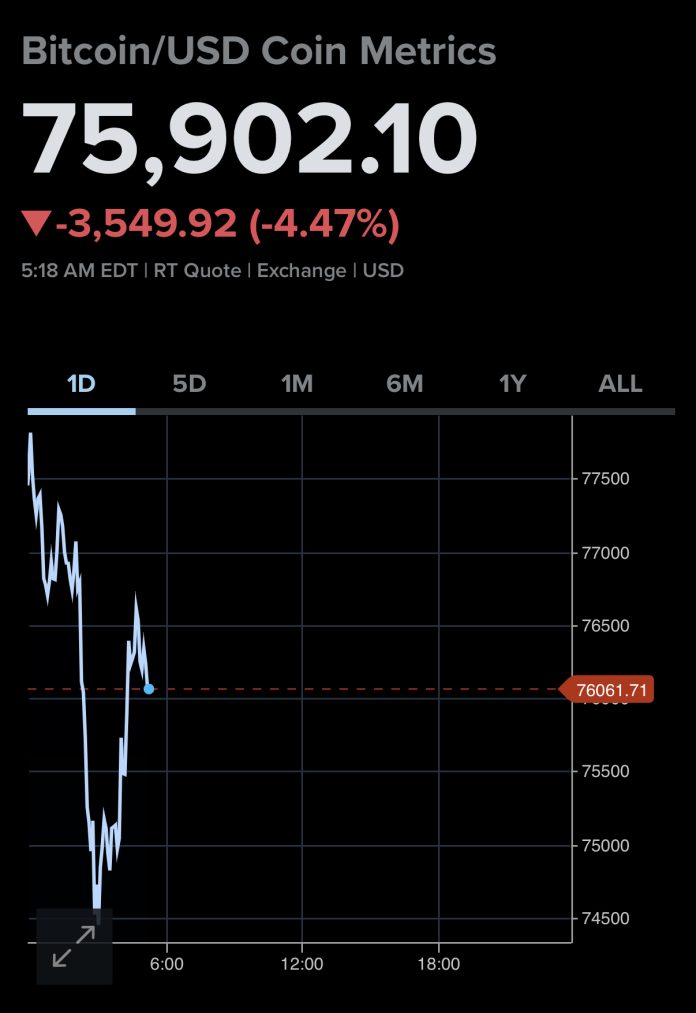 As investors expected financial market instability after a sharp loss in U.S. stocks as a result of President Trump’s planned tariffs, Bitcoin dropped below $80,000, trading at about $76,221, a 4% decrease.