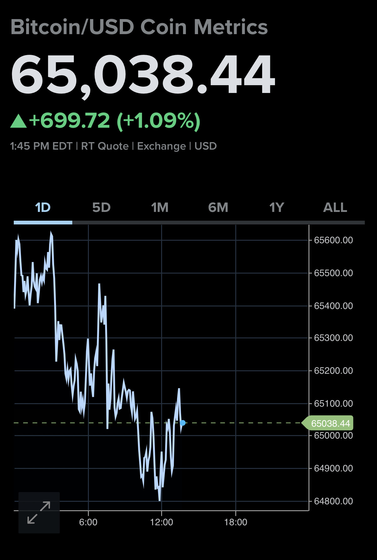 Bitcoin (BTC) over the previous day in US dollars (USD). On June 19, 2024, at 1:45 PM EDT, the price of Bitcoin is $65,038.44, up $699.72 (1.09%) from the day before.