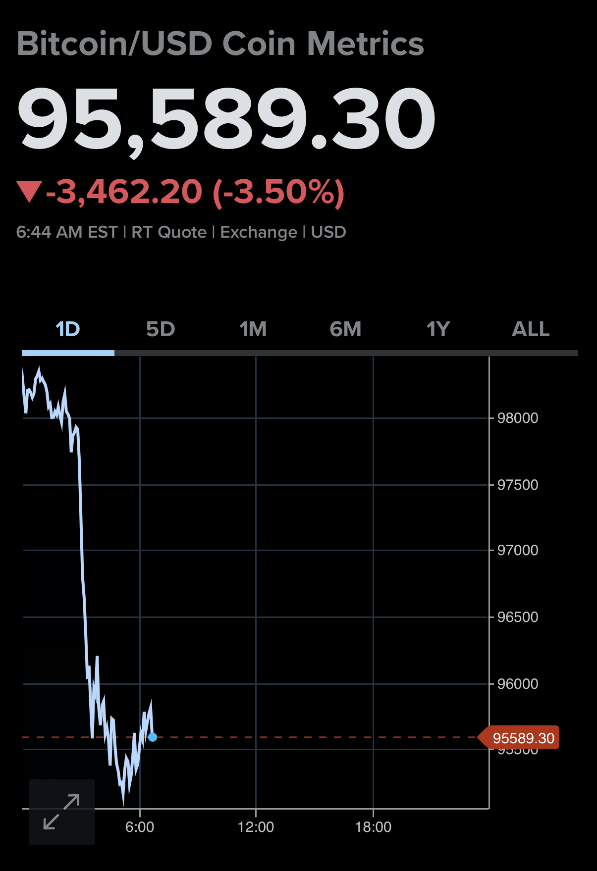 HomeBusinessThe Rollercoaster Ride of Bitcoin: A 3.50% Drop in a Day Business The Rollercoaster Ride of Bitcoin: A 3.50% Drop in a Day By Ramatu Sesay Thursday, December 26 2024, 6:48 am 0 443 FacebookWhatsAppLinkedin Bitcoin in US dollars for a 24-hour period that concludes at 6:44 AM EST. The price has dropped significantly, and it is now $95,589.30, down $3,462.20, or 3.50%. Source (CNBC) SourceCNBC FacebookWhatsAppLinkedin Previous articleTech Stocks Lead the Gains as the S&P 500 Rises to Start the Holiday-Shortened WeekNext articleOracle’s Stock Rises the Most Since the Dot-Com Boom, as Larry Ellison Ends a Stellar Year Ramatu Sesay RELATED ARTICLES Business Circle’s Stock Increases as its Second-Quarter Revenue Soars 53% Due to Robust Stablecoin Growth Ramatu Sesay - Tuesday, August 12 2025, 8:52 am Business Ethereum Reaches 2021 Highs after Breaking the Crucial $4,000 Level, as Bitcoin Regains $120,000 Ramatu Sesay - Monday, August 11 2025, 12:40 pm Business Ahead of U.S. Senators’ “Crypto Week,” Bitcoin Hits New Highs of Over $120,000 Ramatu Sesay - Monday, July 14 2025, 9:50 am LEAVE A REPLY Cancel replyLog in to leave a comment - Advertisment - Most Popular Stocks Jump as Congress Begins to Consider a Deal to End the Shutdown Monday, November 10 2025, 10:28 am As Congress Begins to Consider a Deal to End the Closure, Stock Futures Increase Monday, November 10 2025, 9:01 am As Congress Begins to Consider a Deal to End the Closure, Stock Futures Increase Monday, November 10 2025, 7:30 am As a Deal to End the Government Shutdown Approaches, Stock Futures Climb Monday, November 10 2025, 6:22 am Load more Recent Comments Ramatu Sesay on Bitcoin below $21,000 Ramatu Sesay on How to Use Bitcoin: A Comprehensive Guide Ramatu Sesay on Up to $20,000 in Student Loans Cancelled & Student Debt Relief Plan Explained Ramatu Sesay on InfoTech’s Summer Camps mabintyaliesesay on Happy Juneteenth Day, 2022! Ramatu Sesay on Happy Juneteenth Day, 2022! mabintyaliesesay on Bitcoin on the Rise! mabintyaliesesay on Bitcoin on the Rise! Ramatu Sesay on Bitcoin on the Rise!