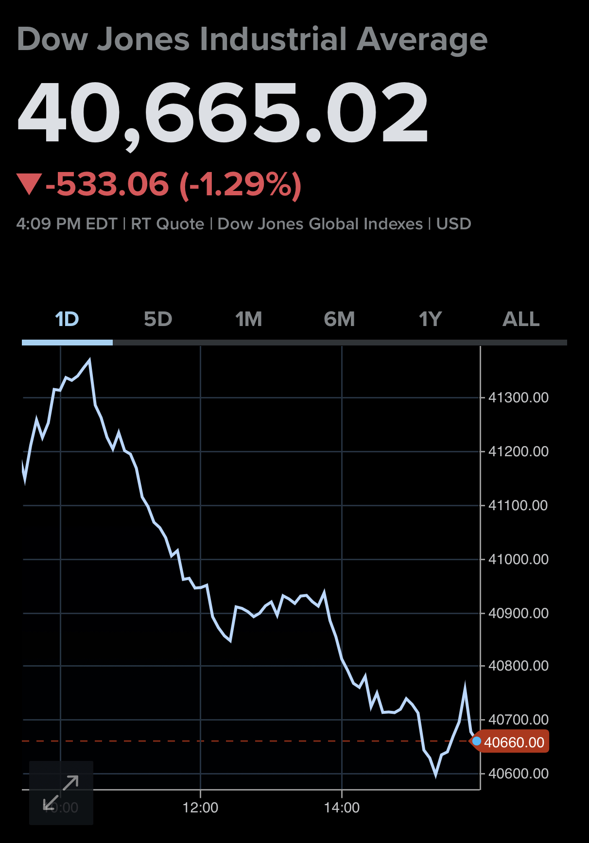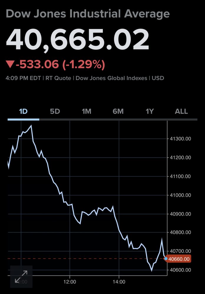 A drop of 544 points, or 1.3%, was seen in the Dow Jones Industrial Average. The S&P 500 experienced a 0.6% decline. The heavily tech-heavy Nasdaq Composite had a 0.5% decline.