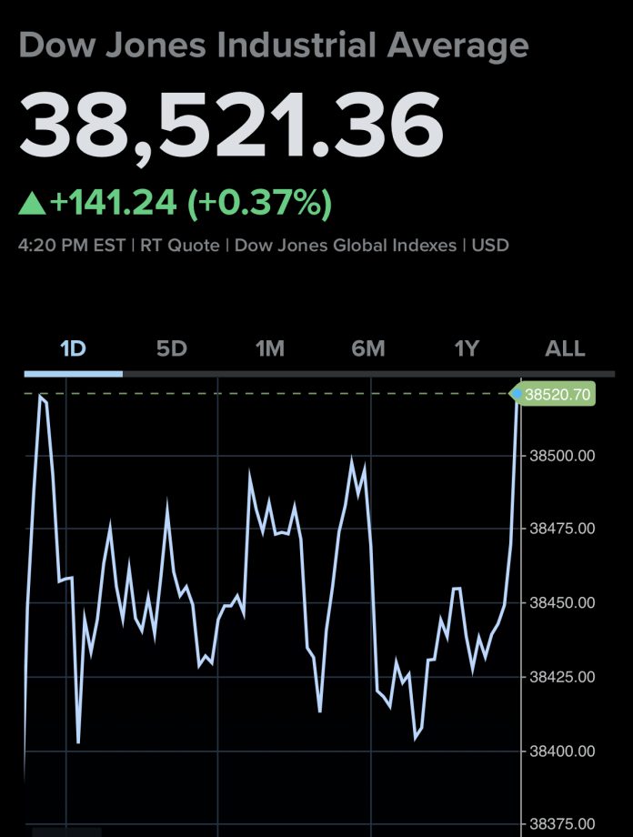The S&P 500 increased by 0.23% to close at 4,954.23, while the Nasdaq Composite saw a slight uptick of 0.07% to end at 15,609.00. The Dow Jones Industrial Average surged by 141.24 points, or 0.37%, reaching a closing level of 38,521.36.