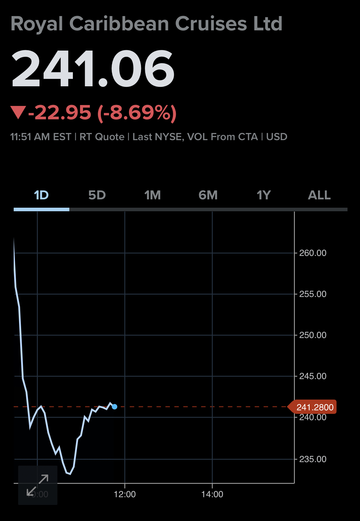 Carnival’s stock declined 9%, Royal Caribbean’s 11 percent, Norwegian Cruise Line’s 10 percent, and Viking Holdings’ 7 percent decline.